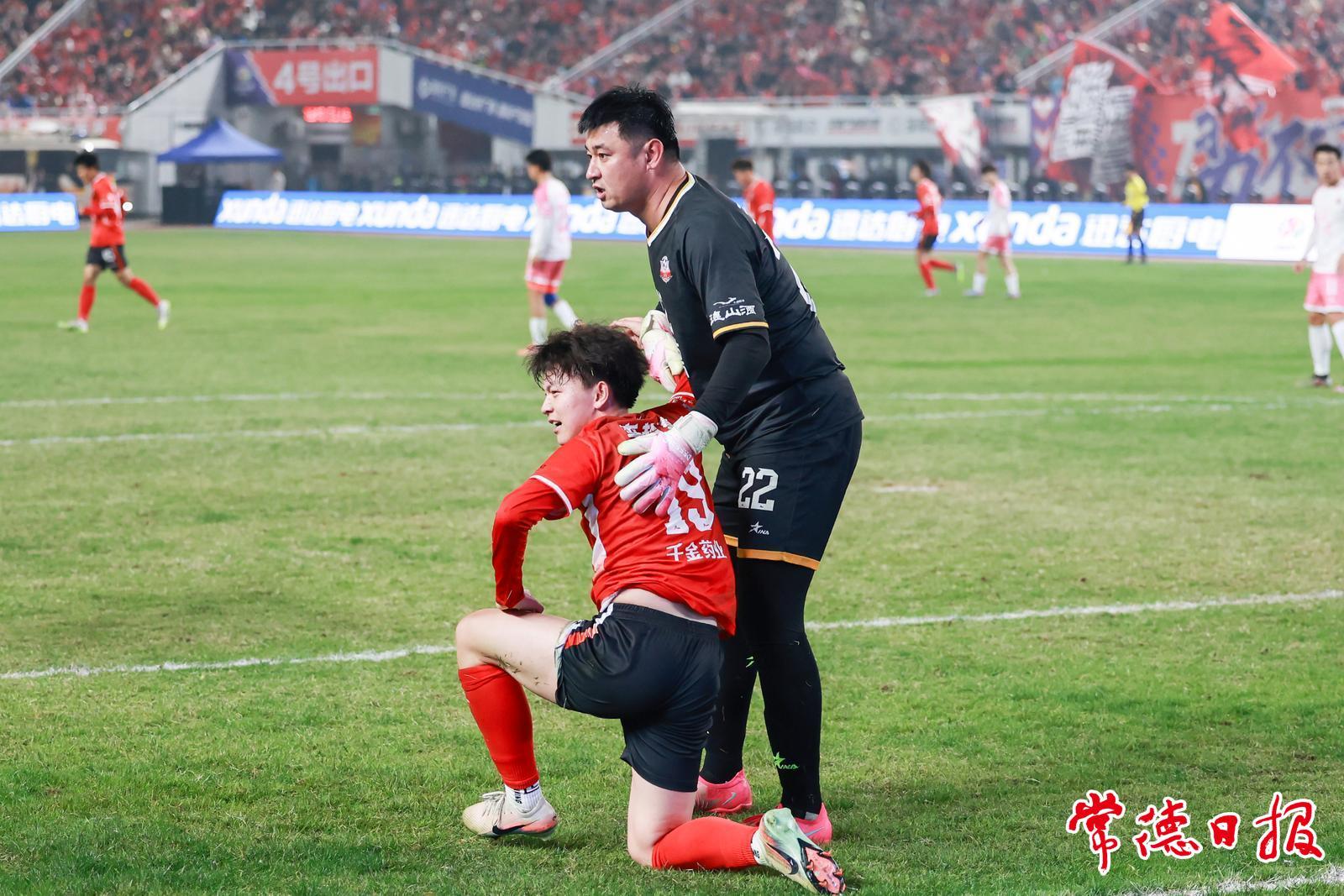 赛场上,激烈的拼抢中,对方球员摔倒在地,常德队门将王峰琦扶起对方。这暖心的举动,传递了竞技体育中超越胜负的温暖与善意