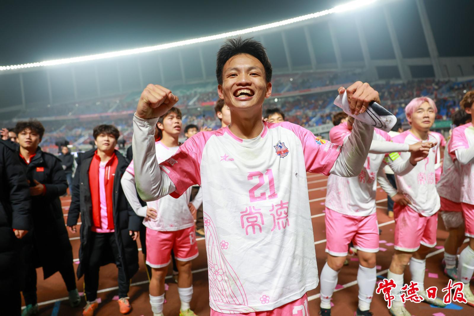 常德队球员王奎峰踢出一记精彩的“勺子”点球,帮助常德队成功晋级决赛。进球后,他转身向看台挥手呐喊,与全场球迷共同庆祝这场胜利