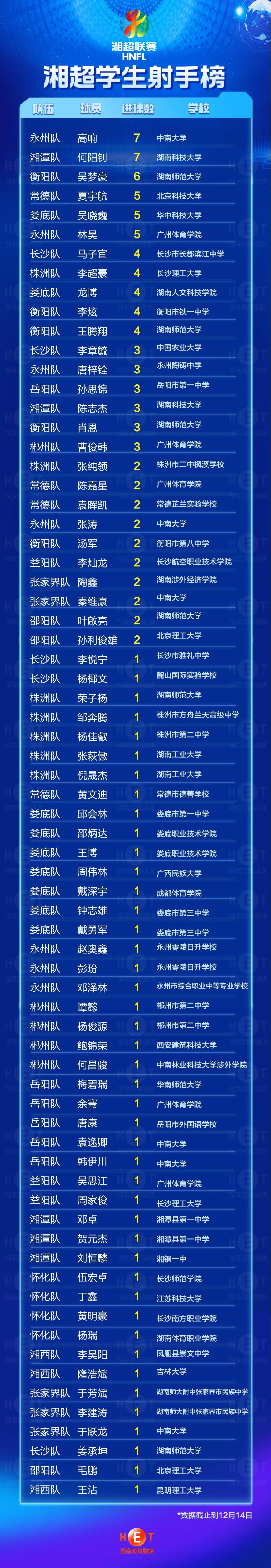 最新湘超学生射手榜来了! 字体:小 大 打印 分享到: 2025-12-16 17:20 来源:湖南教育电视台 点击次数: 次 在湘超淘汰赛1/4决赛中,共产生了7粒进球,其中有5粒是由学生球员攻入的。目前,永州队4号球员高响与湘潭队9号球员何阳钊均以7粒进球,并列湘超学生射手榜第一。 终审:谭琳琳 【我要纠错】 责任编辑:谭琳琳 扫一扫在手机打开当前页
