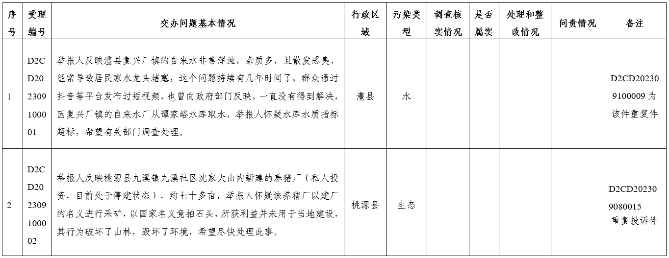 9月10日08:00至20:00,督察组接群众生态环境保护方面信访举报件14件(来电11件、来信3件),经整理合并同一投诉件后转办我市13件(含重点件2件),其中:涉及武陵区1件、鼎城区2件、桃源县1件、石门县2件、澧县2件、津市市1件、西洞庭1件、鼎城区和高新区合办1件、市农业农村局和有关县市区合办2件。已按要求交由相关县市区和市直部门办理,现将群众信访举报转办和边督边改公开情况予以公开(详见下表)。
