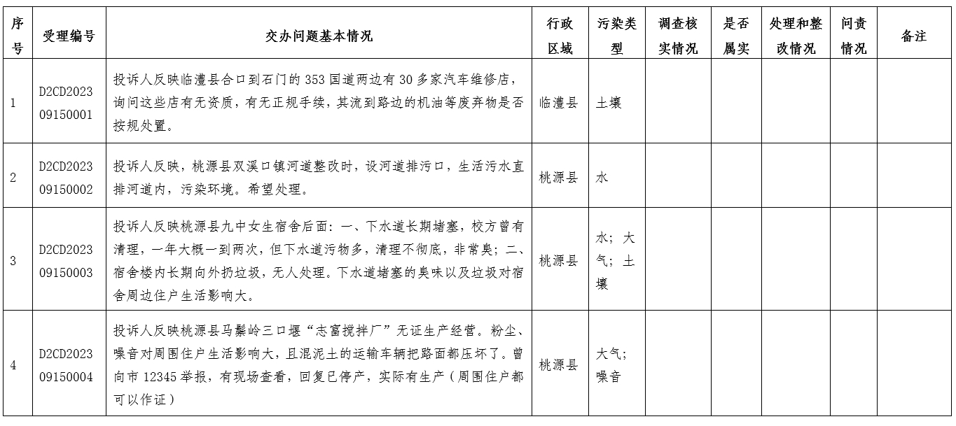 9月15日08:00至20:00,督察组接群众生态环境保护方面信访举报件17件(均为来电),经整理合并同一投诉件后转办我市13件,含重点件1件,其中:涉及武陵区2件、桃源县5件、临澧县2件,澧县、石门县和高新区各1件,武陵区和市国资委合办1件。污染类型:噪音3件、大气污染4件、水污染3件、土壤1件、生态破坏1件、其他1件。已按要求交由相关县市区和市直部门办理,现将群众信访举报转办和边督边改公开情况予以公开(详见下表)。