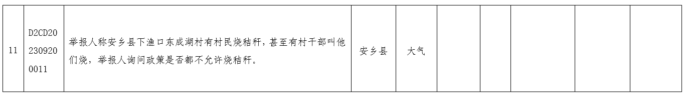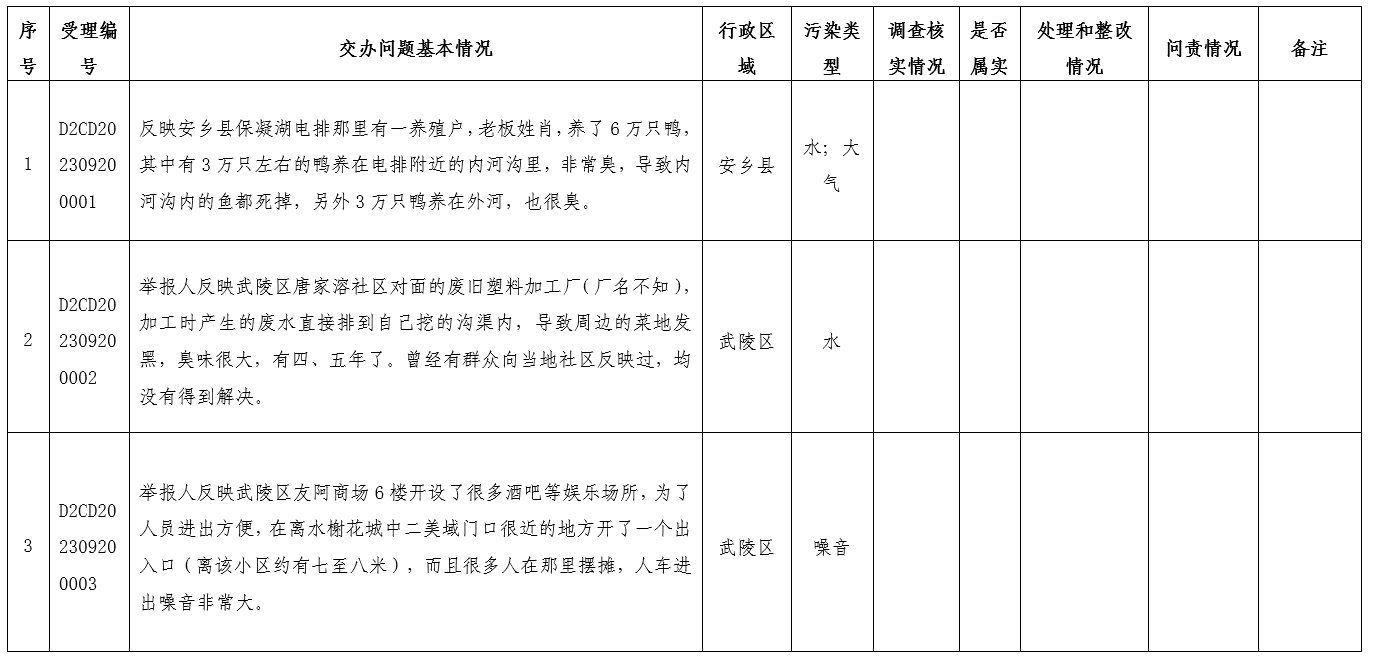 9月20日08:00至20:00,督察组接群众生态环境保护方面信访举报件12件(均为来电),经整理合并同一投诉件后转办我市11件(含重点件1件),其中:涉及武陵区4件、安乡县2件,汉寿县、澧县、津市市、市住建局各1件,鼎城区、汉寿县、津市市、安乡县、桃源县合办1件。污染类型:水污染6件、大气污染2件、噪声污染2件、生态破坏1件。已按要求交由相关县市区和市直部门办理,现将群众信访举报转办和边督边改公开情况予以公开(详见下表)。