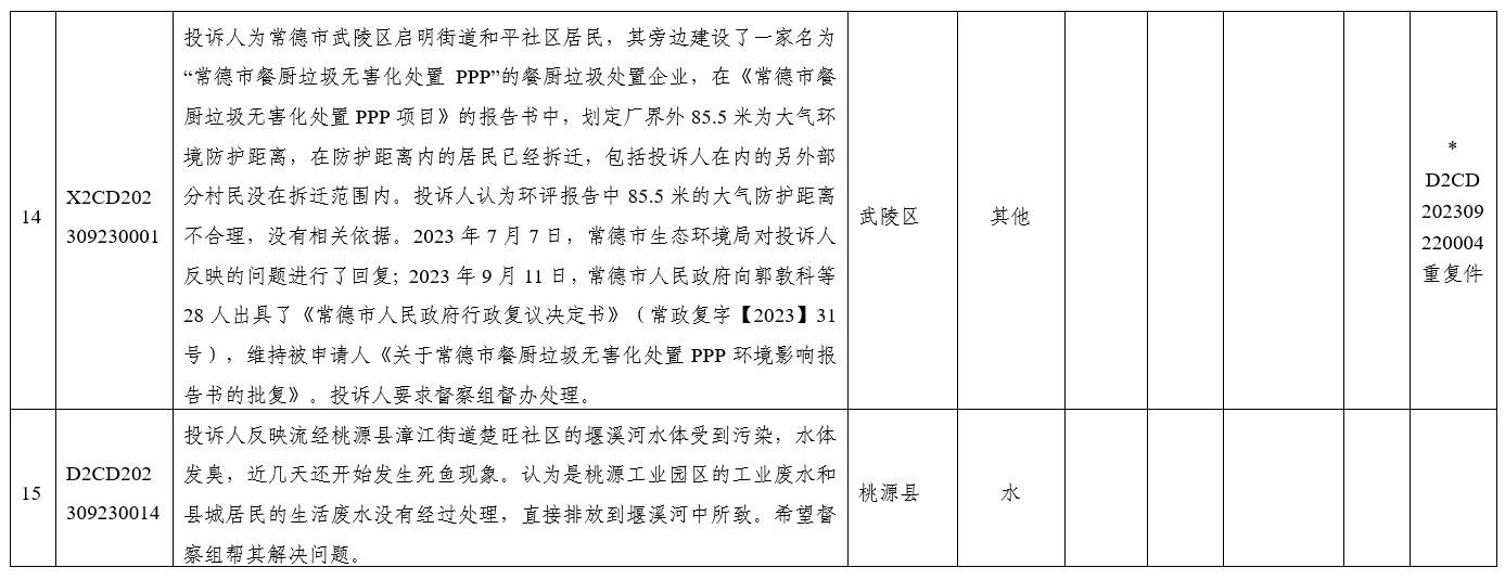 9月23日08:00至20:00,督察组接群众生态环境保护方面信访举报件15件,含重点件2件,其中:涉及武陵区5件、汉寿县1件、桃源县2件、临澧2件、石门县1件、澧县1件、安乡县2件、柳叶湖1件。污染类型:噪声污染3件、水污染5件、大气污染4件、其他污染3件。已按要求交由相关县市区办理,现将群众信访举报转办和边督边改公开情况予以公开(详见下表)。